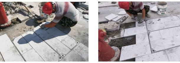 放入蓋體時(shí),應(yīng)先清理支座內(nèi)的雜物,避免影響平整度、造成日后開啟困難。在蓋體底板表面涂刷環(huán)氧樹脂并均布投撒碎石形成堅(jiān)固毛糙面,增強(qiáng)面層鋪裝和蓋體底板的抗滑能力。在鋪裝層鋪設(shè)前應(yīng)布設(shè)高程控制網(wǎng),嚴(yán)格按控制網(wǎng)高程進(jìn)行鋪設(shè)。按BIM模型鋪設(shè)圖樣復(fù)核放線,用測量儀器打方格,并用對角線檢驗(yàn)方格是否方正,定出基準(zhǔn)線。每個(gè)方格應(yīng)根據(jù)路面預(yù)制塊塊型尺寸及道路寬度確定,一般以5m左右為宜。然后在樁橛上標(biāo)注設(shè)計(jì)高程,以每個(gè)蓋體中點(diǎn)的橫向中心線在路緣石邊設(shè)定鋪設(shè)路面磚基準(zhǔn)點(diǎn)(起始鋪筑點(diǎn)),并往井四周進(jìn)行鋪設(shè),根據(jù)鋪磚的方向通過基準(zhǔn)點(diǎn)設(shè)置兩條互相垂直的基準(zhǔn)線。順路緣石鋪磚時(shí),路緣石即為一條基準(zhǔn)線;每個(gè)井邊的路緣石的基準(zhǔn)點(diǎn)同時(shí)鋪筑路面磚時(shí),根據(jù)形狀尺寸計(jì)算好兩基準(zhǔn)點(diǎn)之間的距離,兩基準(zhǔn)點(diǎn)的距離不宜過大,不宜超過10m;如距離較大,為控制鋪筑進(jìn)度,應(yīng)根據(jù)工程規(guī)模及塊型尺寸宜加設(shè)間距為5~10m的縱、橫平行路面磚的基準(zhǔn)線。