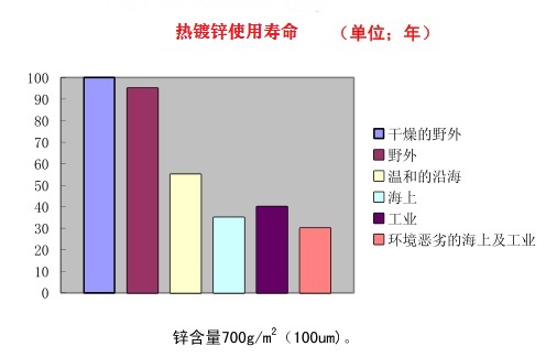 壓焊鋼格板表面熱鍍鋅處理,熱鋟鍍鋅是將普碳鋼或低合金結(jié)構(gòu)鋼浸人熔融鋅浴中獲得具有熱鍍鋅層的鋼,主要用于鋼鐵的防大氣腐蝕.熱鍍鋅的優(yōu)點(diǎn)在于其防腐能力強(qiáng),鍍鋅層的附著力和硬度較好,有較長(zhǎng)的使用壽命.熱鍍鋅層厚100um時(shí)產(chǎn)品在以下各種環(huán)境中的壽命見(jiàn)圖3.同時(shí),熱鋟鍍鋅碳鋼產(chǎn)品在PH值6~12.5范圍內(nèi),鋅層表面形成的保護(hù)膜,抗腐蝕性能較好,經(jīng)熱鍍鋅處理的鋼格板,使用壽命至少30年免維護(hù)。