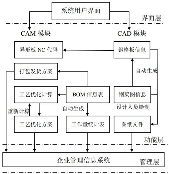 系統功能層面可分為 CAD 與 CAM 兩個模塊(如圖 所示),實現了 CAD/CAM 集成與信息共享。在設計過程中,設計人員將客戶的鋼梁布置圖導入系統或在系統中手工繪制鋼梁圖(即布板邊界圖),隨后進行自動區域分割,選定布板區域自動生成鋼格板,同時系統自動編號并可產生 BOM 信息表。BOM 表為整個系統數據交換處理的核心,是實現 CAD/CAM 集成的關鍵環節。通過 BOM 表可提取相關信息自動導出 Excel工作量統計表,以便企業對工人進行績效評估。
