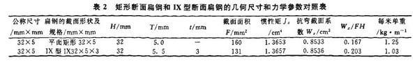 IX型斷面扁鋼系列的最大特點是可以按YB/T4001.1~2007行業標準中所有矩形斷面扁鋼和I型斷面扁鋼的規格都對應的原則而設計。以公稱尺寸32 mm×5 mm扁鋼為例,將矩形斷面扁鋼和IX型斷面扁鋼的幾何尺寸和力學參數對照列入表2。