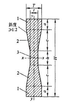 新型斷面扁鋼”稱為“IX型斷面扁鋼”,IX型斷面扁鋼的橫截面上下兩端為兩個厚度較厚的矩形,截面中間為厚度較薄的矩形,在兩者之間由兩個過渡的等腰梯形相連接,這兩個等腰梯形邊的斜度≥1:2。(見圖2)這種新型斷面形狀既兼容了I型斷面扁鋼和矩形斷面扁鋼的優點,又克服了二者的不足;既改善了扁鋼腰部的高厚比h/t,又使扁鋼兩端增加了兩個梯形過渡區,使嵌入式壓焊接觸不到最薄的腰部區,提高了抗側失穩定性。
