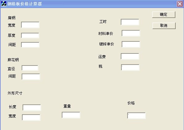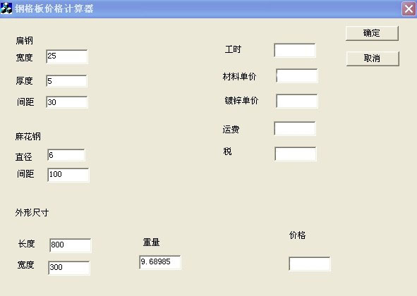 隨便一種普通鋼格板只要知道型號,比如G255/30/100 外形尺寸 800*300 然后在軟件相應位置輸入相應的數據,鋼格板的重量就在相應的位置顯示出來,尤其對于一些亂尺的鋼格板能起到事半功倍的效果。知道重量后,在右邊輸入原材料單價和鍍鋅單價和工人工時費用,鋼格板的成本價格就一目了然了。
