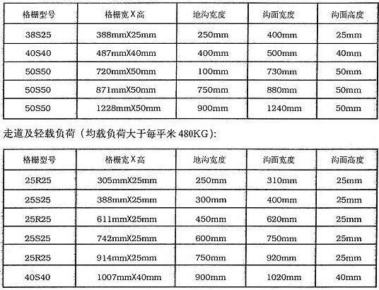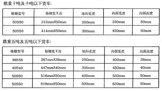 考慮到地溝道蓋板對機動車的承載力,對地溝蓋板用格柵的力學性能測試是模擬汽車后車輪所加載在其上的最荷載為設計參數的。根據測試結果和格柵的規格,隆鑫公司特列為以下表格參考