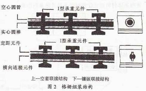 典型的格柵組裝結構如圖2所示。圖2-a所示結構,其定距元件由空心圓管分段組成,其橫向連接元件為實心圓棒,圓管空套在圓棒上,圖2-b所示結構,其定距元件本身是一個帶有若干定距槽的整體棒材,其緊密的鑲嵌在作為橫向連接元件的帶有縱向溝槽的實心棒材上。兩者相比,前者拼裝相對方便但組裝成的格柵整體不如后者牢固,推薦采用后者。