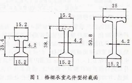 拉擠玻璃鋼格柵需要三種型材,分別用作承重、定距和橫向連接元件。承重元件常用截面形狀有|型、I型、T型。理論上講,I型最好,因為承重元件主要承受彎曲荷載作用,而截面積相同時I型材的抗彎界面系數較大。常見的承重元件截面形狀和尺寸如圖1所示。