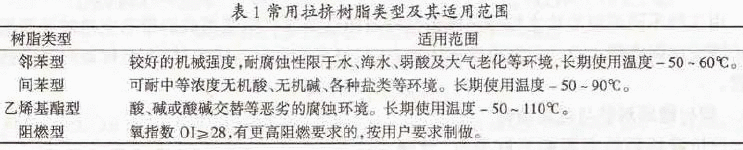 拉擠玻璃鋼I型材結構如圖三所示。其中作為增強材料的玻璃纖維無捻粗紗、玻璃纖維氈和舉止表面氈由里到外的三明治配置形式,出賦予I型材極高的縱向、橫向強度外,在I型材外表面還能與基體材料一起形成富樹脂層,以提高I型材的耐腐蝕并改善制品的外觀。基體材料一熱固性樹脂為主并輔之以一些功能性填料和助劑,其作用使增強材料與其均勻的結合固化成一體并賦予I型材良好的物理化學性能。在設計生產時,一定要根據格柵產品的實際使用條件來選擇拉擠樹脂。常見的拉擠樹脂類型及使用范圍見表1.
