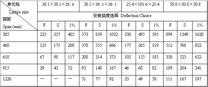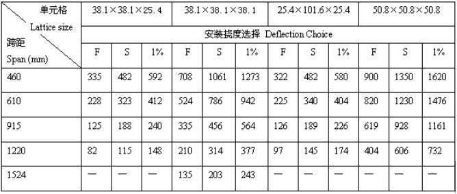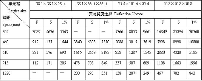 二、玻璃鋼格柵板安裝最大線性負(fù)載表(305mm 寬板) ( kgf )