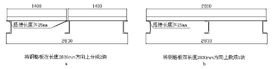 鋼格板長度的設計應滿足型號的跨距要求,而且扁鋼方向兩端與梁的搭接距離不能少于25毫米。具體設計時,可以根據鋼格板生產工藝和安裝現場施工條件對其長度尺寸進行適當的調整。如圖所示,方案A將鋼格板沿長度方向拆分為兩塊,這種布置方式方便人工搬運。方案B將其設計為一個整體,這種方式適用于有起吊設備的安裝現場,執行時相對于方案A簡單,而且整體化設計對生產加工而言更容易實現。在小批量的合同中,設計時要避免鋼格板的尺寸過大,尺寸過大無論對于車輛的車廂容積還是運輸費用都有較高的要求。根據以上情況綜合考慮,鋼格板的最短不應小于鋼梁最小跨度,最大不宜超過4米。
