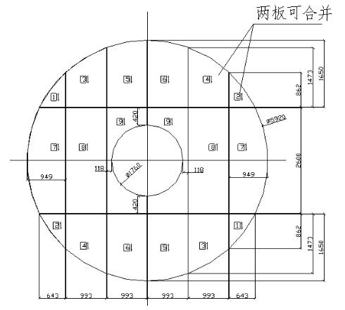 鋼格板整體鋪設時,應以鋪設區域的某一軸線或者孔中心線為基準向一側或兩側展開。當設計區域為矩形平臺時,要以某軸線為基準進行鋪設。如果平臺上有較大的開孔,也可以孔的中心為基準進行鋪設。當區域為一圓形平臺時,應以美觀省料的前提,以圓形平臺中心線為基準向四周進行鋪設。特殊情況下也可以從一邊向另一邊進行整體鋪設,最后按剩余量來決定采用接板還是窄板進行補償。整個平臺的鋪設方案要符合整齊、對稱、均勻的標準。如圖所示,在實際設計過程中,應根據圖紙中鋼梁的布置方案確定鋼格板具體的鋪設方法,同時兼顧節省原材料、減少工作量的原則。