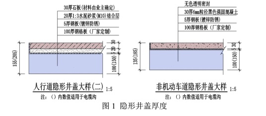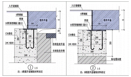 待混凝土初凝后,即可安裝隱形蓋板,并在隱形蓋板四周設(shè)置8mm厚鋼板,與預(yù)埋鋼板焊接,固定隱形蓋板位置。人行道上隱形井蓋鋪裝層采用2cm厚1:3水泥砂漿(M10)結(jié)合層貼3cm厚花崗巖石材(石材與井蓋周邊人行道一致),非機動車道隱形井蓋鋪裝層采用3cm后6mm粒徑黑色強固混凝土并用無色透明密封,詳見圖。隱形井蓋鋪裝層應(yīng)與井蓋周邊路面順接相平。