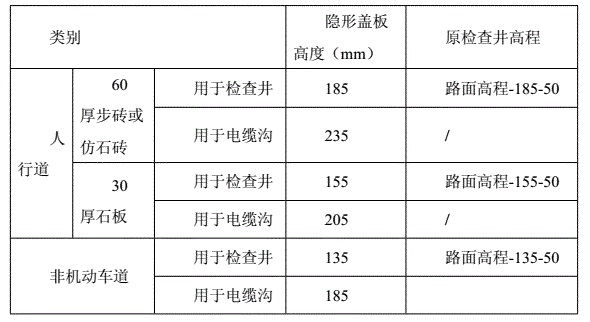(5)檢查井與道路銜接應(yīng)平順,設(shè)置于人行道上的井蓋宜采用隱形井蓋(井蓋上貼面與人行道鋪裝一致),檢查井井框與路面高差不應(yīng)大于土5mm,井 蓋與井框高差不應(yīng)大于土3mm。檢查井蓋上應(yīng)在醒目位置標注專業(yè)管線類型。