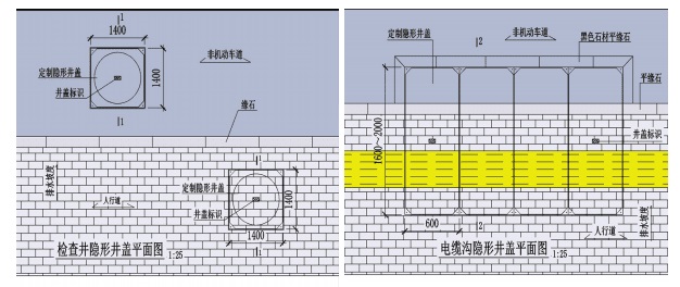 人行道上的隱形井蓋面層鋪裝和人行道面磚鋪裝材料一致,遇到盲道磚應(yīng)與之順接,隱形井蓋橫跨非機動車道和人行道時,在隱形井蓋周邊加鋪一圈黑色平緣石,道路人行道鋪裝結(jié)構(gòu)形式順接原人行道。