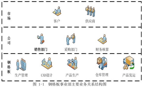 鋼格板事業部主要負責鋼格板產品的設計、開發、生產和發運,原材料采購和銷售分別由股份公司采購部和貿易部負責,如圖1-1所示。