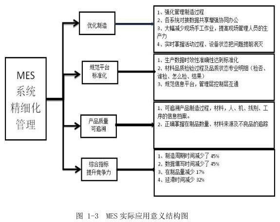 由于鋼格板MES系統的開發和實施都是以企業開放為主,外部協助為輔。對生產制造的管理細節和工藝流程比較清楚,系統實施后將會提升生產制造過程精細化管理。主要表現為生產制造組織精細化、工藝標準化、行為規范化、數據精確化。從優化制造、信息平臺標準化、產品質量可追溯性、綜合指標提升方面展示MES系統的實施給企業生產制造帶來的效益。如圖1-3所示。