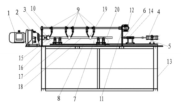 1、電機;2、減速機;3、夾持機構;4、動力推桿;5、第一支撐架;6、定位器;7、托具;8、滑軌;9、焊槍;10、橫桿;11、支柱;12、十字滑臺;13、床身;14、第二支撐架;15、第一空心球;16、第一連接桿;17、第二空心球;18、第二連接桿;19、第三空心球;20、第三連接桿;21、滾輪或滾軸;22、托具底座;