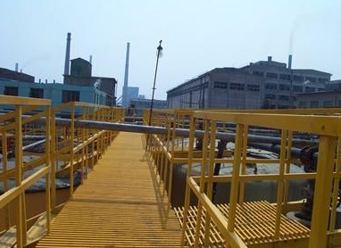 △棧道:化工廠以及其它一些腐蝕嚴(yán)重的工廠,每年在設(shè)備與設(shè)備之間的通道空中棧道(一般為鋼結(jié)構(gòu))的維護(hù)費(fèi)用相當(dāng)大,采用FRP格柵制作棧道就可以很好的解決這些問題。