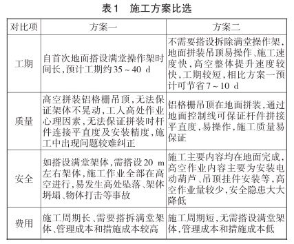 通過本技術的實施,不需要搭設滿堂操作架、地面拼裝操作簡單、速度快、施工難度大為降低、施工質量一次成優,避免返工,大大縮短了不必要的工期損失,相對于傳統搭設滿堂架高空安裝吊頂施工工藝,大大縮短了工期。施工方案比選見圖1.