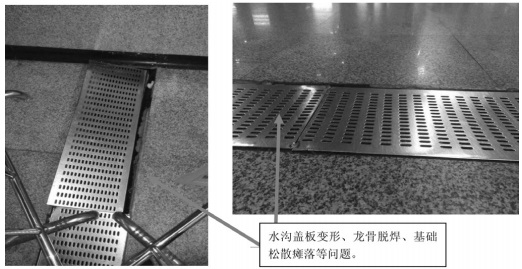 出入口水溝蓋板用于通道橫向截水和排水作用,同時作為通道乘客踩踏的行走面。某路線 23 個車站出入口均有水溝蓋板,蓋板形式均為不銹鋼平板加不銹鋼框龍骨的形式,易產生面板與龍骨脫離的情況,因為面板為平板樣式,一旦面板脫離龍骨,平板會被反復踩踏呈凹形,導致面板四周翹起;同時在長期使用過程中由于乘客大量踩踏容易造成蓋板塌陷、翹角及基礎水泥砂漿松散導致水溝蓋板整體下陷等;類似問題維修矯正難度大,故障易反復出現,同時維修不及時又極易產生客傷事件。