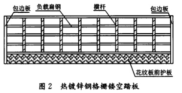設(shè)計(jì)踏板時(shí)考慮到傳統(tǒng)鋼板積水、積塵、不易清掃等弊端,新型入倉斜爬梯踏板設(shè)計(jì)為熱鍍鋅鋼格踏板。爬梯踏板長900mm、寬230mm、厚30mm、熱鍍鋅鋼格柵鏤空踏板,6道鋼格兩側(cè)用熱鍍鋅鋼板焊接成長方形,鋼格框的前側(cè),兩鋼格之間加焊寬度為50mm條形紋熱鍍鋅鋼板,增加了爬梯主體的穩(wěn)固性。如圖2所示。鋼格面為波浪狀,每節(jié)踏板與熱鍍鋅板斜梁用304不銹鋼螺絲連接,兩節(jié)踏步之間高為200 mm。