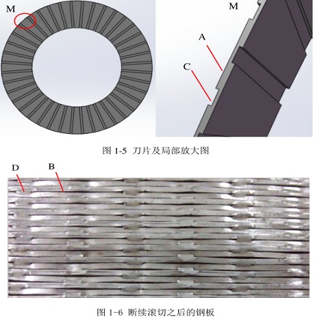 首先具體介紹一下,鋼板是如何被斷續滾切的。如圖1-5所示,分別為刀片和刀片的局部放大圖,很多片相同的刀片安裝在兩根平行的刀軸上,帶有缺口的刀片之間墊有比刀片厚度稍大的墊片,以便相互咬合的刀片間形成側向間隙。安裝后,刀片沿軸向交錯分布于上下兩刀軸上,帶有缺口的刀片兩側同時參與剪切(最外側的刀片除外),當刀片的一側刀刃A與之相鄰的刀片的刀刃重合時,則鋼板局部被剪斷,形成裂縫B,當刀片的一側缺口C與之相鄰的刀片的缺口重合時,則鋼板的局部不被剪斷,形成節點D,另外節點之間的部分稱之為肋條。隨著刀軸的轉動,鋼板跟著前進,上述的斷續剪切過程不斷重復。經過斷續滾切完之后的形狀如圖1-6所示。