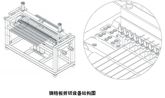 鋼格板剪切設備包括框架和安裝于框架上的剪切機構,剪切機構包括壓緊裝置、頂升裝置、導向裝置、立柱、剪切工作部、安裝于剪切工作部的主刀架、副刀架、安裝于主刀架上的主刀片組、安裝于副刀架上的副刀片組、安裝于剪切工作部上的剪切主油缸和剪切副油缸,其中壓緊裝置通過立柱固定安裝于框架上,頂升裝置安裝在框架上通過立柱使導向裝置在立柱上下移動,剪切工作部安裝在導向裝置上,主刀架、副刀架、剪切主油缸、剪切副油缸均安裝在剪切工作部,主刀架上的主刀片組由剪切主油缸帶動主刀架順著拉桿的方向貼合副刀架上的副刀片組移動,主刀片刃口和副刀片刃口相抵接產生剪切力剪斷工件,待剪切工作結束后,由剪切副油缸帶動主刀架復位到初始位置。