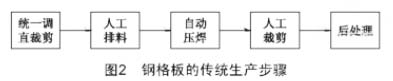 鋼格板的傳統(tǒng)生產(chǎn)方法包括統(tǒng)一調(diào)直裁剪、人工排料、白動壓焊、人工裁剪、后處理5個步驟,如圖2所示。首先由廠家訂購固定長度的直扁鋼,或者對卷扁鋼進(jìn)行統(tǒng)一調(diào)直裁剪,然后由工人進(jìn)行排料,接著由壓焊機(jī)進(jìn)行壓焊,壓焊出來的產(chǎn)品只有一種規(guī)格,再根據(jù)訂單的需要對產(chǎn)品進(jìn)行裁剪,最后進(jìn)行熱浸鍍鋅等后處理。