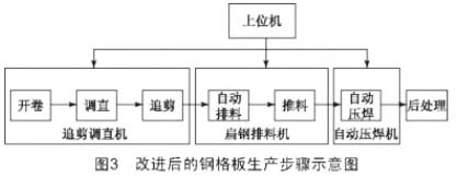 針對鋼格板傳統(tǒng)生產(chǎn)方法的缺點(diǎn),設(shè)計了一種新式生產(chǎn)方法,選擇卷扁鋼作為材料進(jìn)行加工,生產(chǎn)過程分為開卷、調(diào)直、追剪、自動排料、推料、自動壓焊、后處理7個步驟,如圖3所示。與傳統(tǒng)方法相比,新方法最大的不同就是可以直接生產(chǎn)不同規(guī)格的鋼格板,不需要額外進(jìn)行裁剪。