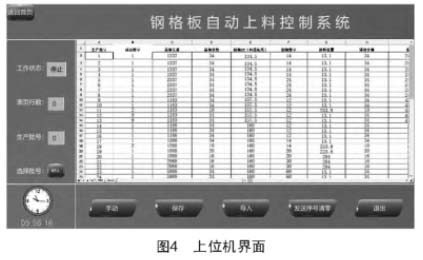 任務(wù)單的內(nèi)容主要是不同規(guī)格鋼格板的具體參數(shù),其格式為“生產(chǎn)序號一成品數(shù)量一扁鋼長度一扁鋼數(shù)量一留頭長度一絞鋼數(shù)量一送料位置”。自動上料機(jī)控制系統(tǒng)界面如圖4所示。