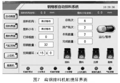 扁鋼排料機(jī)是實(shí)現(xiàn)白動化上料不可或缺的一部分。扁鋼排料機(jī)的觸摸屏包括狀態(tài)顯示、必要的參數(shù)顯示以及手動控制按鈕,可以幫助操作工觀察機(jī)器工作狀態(tài),確認(rèn)鋼格板的參數(shù)和必要時對機(jī)器進(jìn)行調(diào)整,如圖7所示。