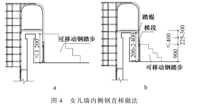 第16類,鋼直梯到達的基礎面為女兒墻時,女兒墻高度≤1200mm時,女兒墻內側加同女兒墻高度的可移動鋼踏步。女兒墻高度為1200mm~2400mm時,女兒墻內側需增加鋼直梯和900高的可移動鋼踏步,改造完后第一級踏棍距下端基準面(鋼踏步頂)滿足≤400mm的要求,如圖4所示。