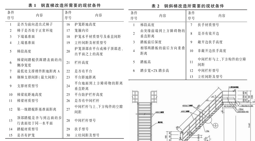 首先根據《固定式鋼梯及平臺安全要求第1部分:鋼直梯》、《固定式鋼梯及平臺安全要求第3部分:工業防護欄桿及鋼平臺》以及國標圖集《鋼梯》中對鋼直梯及平臺設計的規范要求向業主方提出改造設計所需要的條件。本項目以表格的形式向業主方提出所需的條件(表1),使現狀條件一目了然。