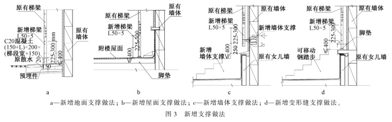 第1類,當支撐距基準面≤2400mm,且第一級踏棍距下端基準面大于400mm時,增加梯梁至下端基準面,并且固定。梯梁增加做法見國標圖集《鋼梯》。固定梯梁做法分為以下幾類:當下端基準面為地面時節點圖見圖3a,當下端基準面為屋面時節點圖見圖3b,當下端基準面為女兒墻時,增加梯梁至女兒墻并且固定(圖3d)或在側墻增加支撐(圖3c),因基準面女兒墻較窄,所以考慮在女兒墻所在的屋面上需增加一個可移動的鋼踏步,擴大鋼梯下端基準面,使第一級踏棍距下端基準面(鋼踏步頂)小于等于400mm。節點見圖3。