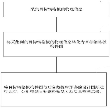 鋼格板產品智能識別檢測方法,其特征在于,該方法包括以下步驟:采集目標鋼格板的幾何信息;將采集到的目標鋼格板的幾何信息轉化為目標鋼格板構件圖;將目標鋼格板構件圖與后臺數據庫預存的設計圖紙進行比對,分析得到目標鋼格板型號及質量檢測結果。