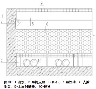 格柵板包括矩形框架結構的包邊角鋼,在包邊角鋼3的內部縱橫交錯布置多個承載扁鋼和橫桿,相鄰兩個承載扁鋼之間的間距小于卵石的直徑,防止卵石跌落至油坑底部,包邊角鋼、承載扁鋼和橫桿相互焊接形成一個整體,通過角鋼支腿支撐在油坑的底部,下層鋼格柵板上鋪設卵石,下層鋼格柵板下部鋪設埋管。