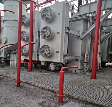 油坑下層的自承重鋼格柵板,包括上層鋼格柵和下層鋼格柵,下層鋼格柵設置在油坑中,上層鋼格柵鋪設在油坑的頂部,用于日常設備檢修、圍護及作為巡視走道使用。下層鋼格柵包括格柵板和多個角鋼支腿,多個角鋼支腿垂直在格柵板的底部,將格柵板支撐在油坑的底部,支撐腳的高度大于埋管的直徑。