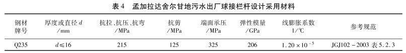 孟加拉達舍爾甘地污水出廠球接欄桿和錨板設計采用Q235A熱鍍鋅材料,材料的設計參數見表4。