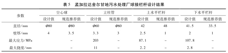 采用1kN/m的設計荷載,達舍爾甘地污水處理廠球接欄桿應力和變形的設計結果列入表5。從表5可看出,立柱管的應力最大,為203MPa,小于215MPa。立管在正常使用狀態下的變形為11mm,小于30mm。上下水平欄桿的最大位移值為2.8mm,小于4.8mm。孟加拉達舍爾甘地污水處理廠球接欄桿的設計滿足最為嚴格的中國標準。上下水平欄桿和立柱管的壁厚大于規范建議值。