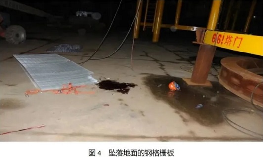 墜落地面的鋼格柵板呈長方形,材質為鍍鋅鑄鋼(Q235B),重量為149.8千克,實測長度3318毫米,寬度1285毫米;該鋼格柵板缺一長方形角(長445毫米、寬180毫米)。該鋼格柵板實測長度比設計長度3365毫米少47毫米,不符合《鋼格柵板及配套第1部分:鋼格柵板》(YB/T4001.1-2007)第7.1條要求(注:7.1鋼格柵板長度的允許偏差為-5~0毫米,寬度的允許偏差為±5毫米)和《套籠、平臺制作圖集》設計說明要求(注:設計說明第5條,主套籠構件安裝偏差應控制在不超過20毫米)。墜落鋼格柵板橫桿上有3處安全帶掛鉤掛扣導致變形痕跡。