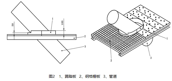 鋼格柵鋪板上需要穿過管道或其他構(gòu)件等原因產(chǎn)生的間隙,或者鋼格柵工作平臺或通道與相鄰構(gòu)件邊緣之間的間隙大于20mm,應(yīng)安裝高度至少為100mm的踢腳板或者安裝填縫板將間隙減小到20mm以下,且滿足以下要求。如果間隙大于20mm且小于或等于120mm,應(yīng)安裝高度至少為100mm的踢腳板;或者由于存在障礙物而使得沒有足夠的空間安裝全尺寸的踢腳板時,則踢腳板的高度可局部減小至最低50mm。如下圖2所示: