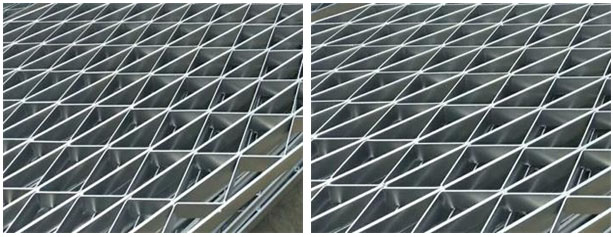 在鋼格柵板選型時,有時設計師需要格柵板高度較小、承載力高、防滑性好、自重輕、格柵孔洞尺寸小的格柵板。米字型格柵板的研發來滿足以上所有設計需求。它是由格柵條進45°交叉焊接生產的格柵板,如在濕滑或有油污地面、傾斜地面上使用米字型格柵板也可選用齒形格柵條。由于橫向和成角度的格柵條共同承擔荷載,因而它具有單位重量承載力高的優點。此外它還具備易于生產、造價低廉、形式整齊劃一等優點。