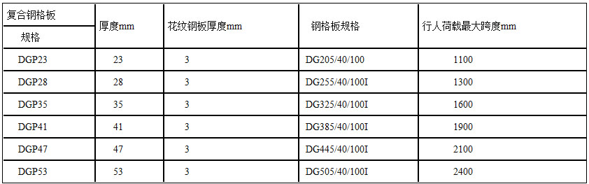 D G P 11 其中P表示復合鋼格板,后面數字表示其厚度。上表只是一些常用標準復合鋼格板。也可采用更厚的花紋板和其他規格的鋼格板。如有別的要求可以來電訂購。