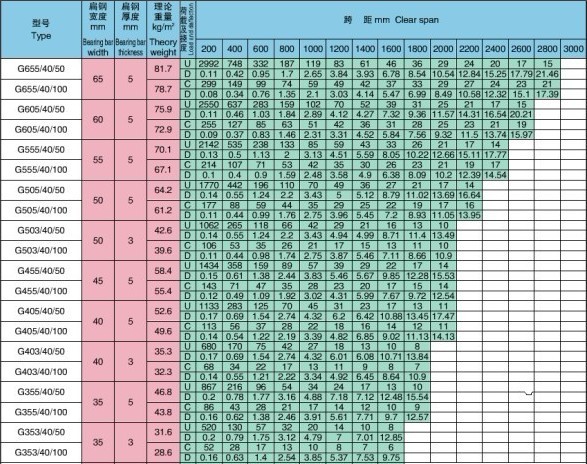 根據(jù)荷載和變形撓度的要求,利用荷載撓度關(guān)系表,用戶可選擇既經(jīng)濟(jì)又安全的鋼格板型號(hào)