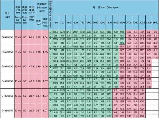 根據(jù)荷載和變形撓度的要求,利用荷載撓度關(guān)系表,用戶可選擇既經(jīng)濟(jì)又安全的鋼格板型號