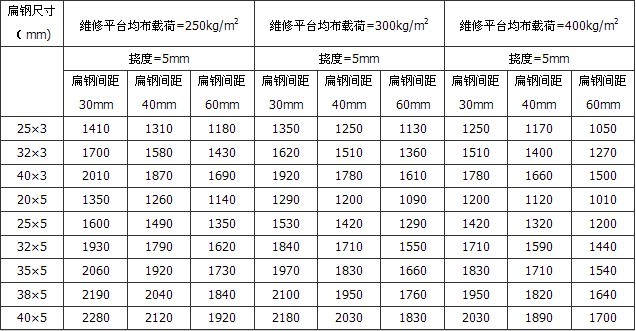 根據實際情況中的鋼格板的需承載的負荷,梁的跨距和所需承受的載荷大小來選型合適的鋼格板型號,一般情況下,鋼格柵板撓度應小于5mm, 如果局部可能超出,則在相應部位加架子,以確保安全。
