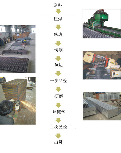 鋼格板生產流程一般可以分為:原材料采購--->壓焊--->修邊-->切割--->包邊--->一次品檢--->研磨--->熱鍍鋅--->二次品檢--->出貨, 等幾個步驟,鋼格板是采用國產優級負載扁鋼和橫桿按一定間距經緯排列,再用高壓電阻焊機焊接而成原板,經切割、切口、開孔、包邊等工序深加工而成客戶要求的成品。以下是生產流程圖。
