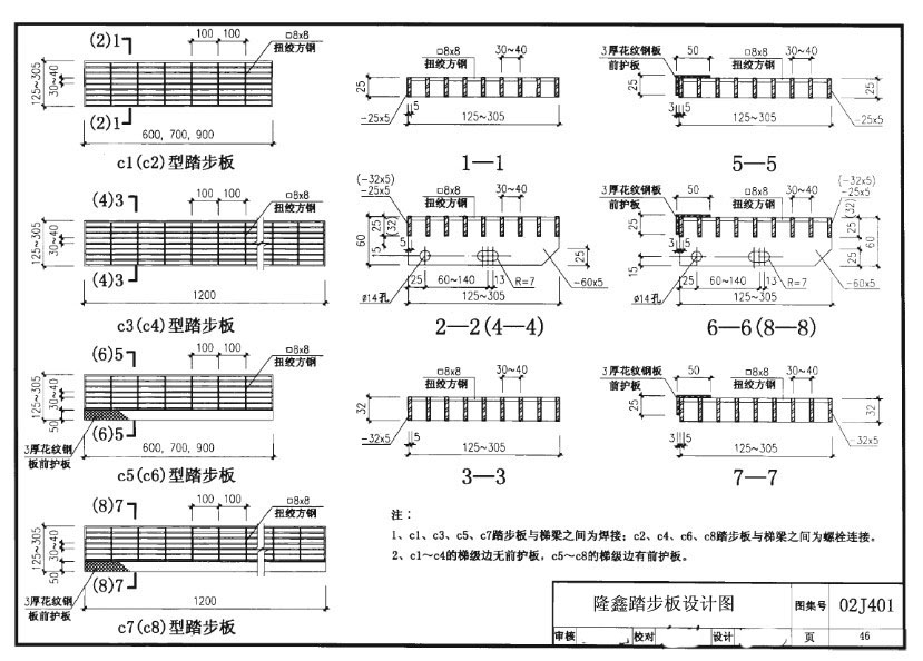 踏步板又叫鋼梯板。根據安裝方式,一般的有焊接固定和螺栓固定兩大類型,直接焊接到龍骨上的,不需要加踏步板的側板,相對比較經濟耐用但是不易拆解,螺栓固定的踏步板兩邊需要加厚的側板,在側板上打眼。踏步板安裝是直接由螺栓固定,可重復回收再利用。具體的看圖紙說明。