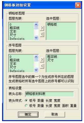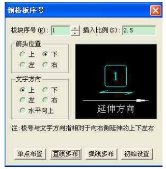 1 單擊菜單命令--標(biāo)注板號(hào),或輸入命令GGB,彈出鋼格板序號(hào)對(duì)話框,其中包括:序號(hào)內(nèi)容,縮放比例,箭頭位置,文字方向,三種繪制序號(hào)的方式按鈕以及初始設(shè)置。如圖