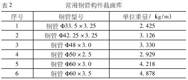 考慮行人上下鋼梯的方便、 舒適,GB50295 - 2008規定鋼梯角度不宜大于 45°[2 ], 因此坡度 >45°的鋼梯使用較少。 大多數防護欄桿扶手的直徑均為 60mm, 該直徑的扶手握裹不方便, 手持該直徑的扶手不能較牢地抓住; 同時, 相關規范也有要求: 扶手宜采用鋼管, 外徑應不小于 30 mm, 不大于 50 mm。 根據市場常用、易購的鋼管信息, 建立直徑在 30 ~ 50 mm 范圍內的截面庫,同表附上已選用的截面作為對比, 如表 2。