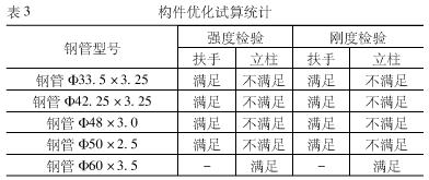 由于所有規范、 圖集都約定立柱的間距不大于 1 m, 因此我們取 1 m 作為計算單元。 分別選用截面庫內的鋼管型號進行設計驗算: ①扶手考慮到邊跨因素, 簡化按跨度為1. 0 m 的簡支梁在跨中集中荷載 0. 89 kN 和均布荷載 1. 0kN/m 作用下計算; ②立柱考慮按懸臂構件高度 1. 2 m, 頂部受 1. 0 kN 的集中荷載作用下計算。 對應撓度控制限制,扶手按跨度的 1 /250, 即不大于 4 mm; 立柱按其高度的 1 /100[9], 即不大于 12 mm。計算結果統計見表 3。