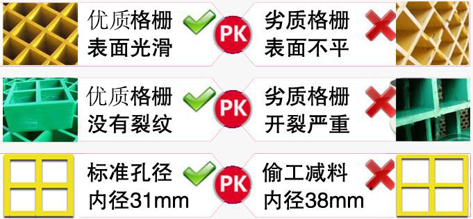成品的對比:優質的玻璃鋼格柵產品外觀無明顯的裂紋,氣孔也較少,顏色亮麗純正,透明度好,具有一定的韌性強度大,表面光潔度好,使用壽命長;而劣質的玻璃鋼格柵產品外觀有裂紋,氣孔較多,顏色不純光澤度不夠。其使用壽命也較短。